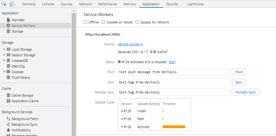 방법 2를 활용해서 서비스 워커를 적용했다. 프로젝트 실행 후 개발자 도구에 들어가 Application → Service Workers에 들어가면 다음과 같이 서비스 워커가 등록된 것을 볼 수 있다.