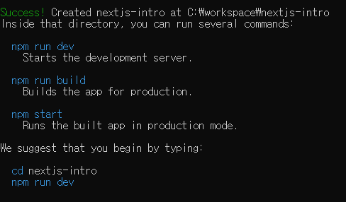 드디어 next 프로젝트 초기화에 성공했다. 아래와 같이 Success!가 뜨면 잘 생성된 것이다.