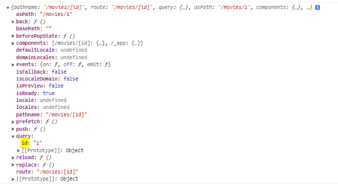 pages/movies/[id].js 에서는 id를 변수의 이름으로 설정한 것이고, useRouter를 통해 확인해 보면, query에 id라는 이름의 객체가 있는 것을 볼 수 있다.